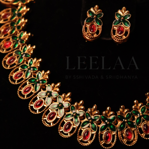 Elevate your ethnic elegance with this Flower Kemp Stone Necklace with Earrings, a stunning piece inspired by South Indian temple jewellery traditions. Designed with floral motifs and studded with ruby red and green Kemp stones, this jewellery set embodies grace, prosperity, and timeless beauty. Handcrafted on a durable alloy base with antique gold polish, the…